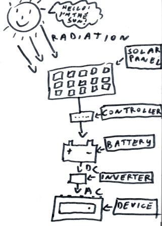 Solar panels charge the battery (the controller insures proper charging) then the battery provides DC voltage to the inverter that converts the DC voltage to normal AC voltage.